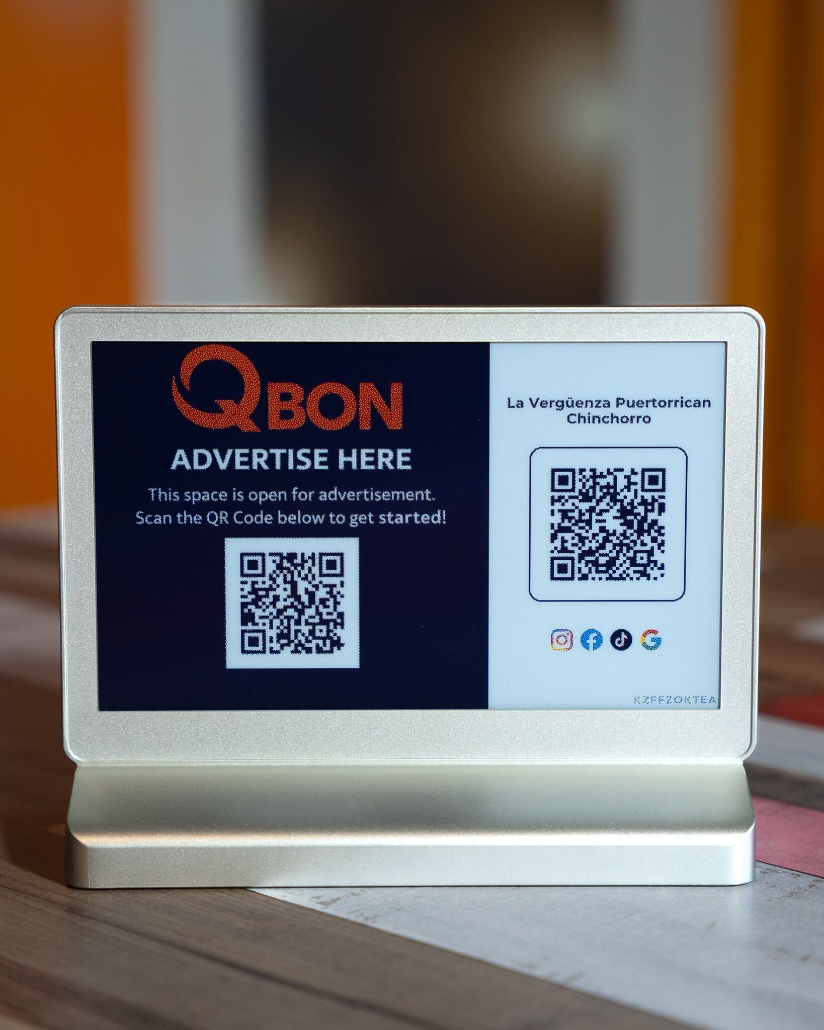 The E-Ink displays show your merchant QR code alongside the advertisement. Your customers can still access your full Qbon profile, storefront, menu, social links, and discounts — exactly like before.
